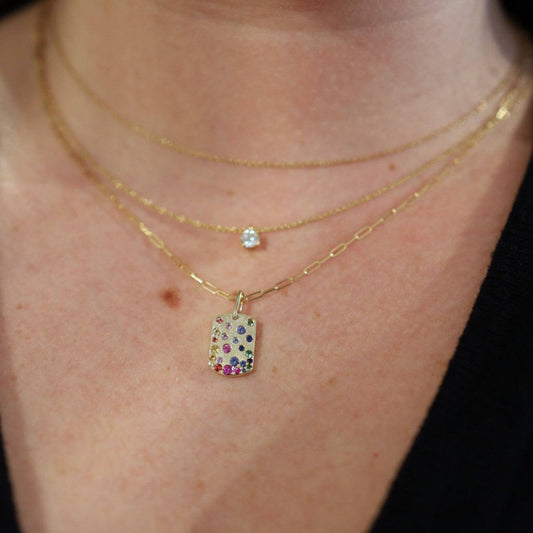 Rainbow Sapphire, Tsavorite & Ruby Dog Tag Pendant – 14k Yellow Gold, Sandblasted Finish, Paperclip Chain