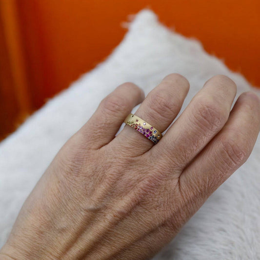Rainbow Sapphire & Tsavorite Cigar Band Ring – 14k Yellow Gold, Sandblasted Finish