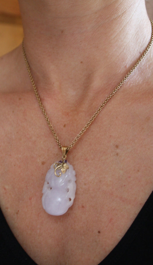 Carved Lavender Jade Pendant with Gourd and Flower / 14k Yellow Gold Amethyst Bail