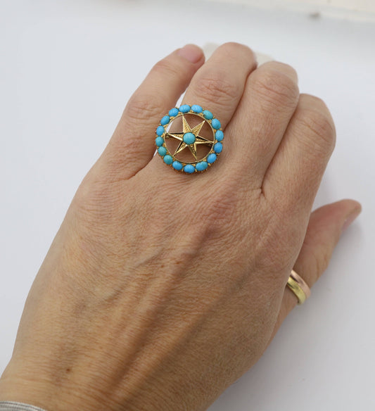 Art Nouveau Turquoise Star in Wheel Ring in 18k Yellow Gold