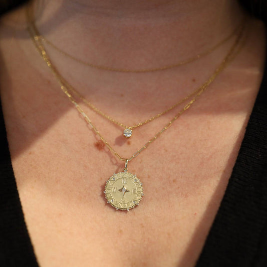 Diamond Compass Medallion Necklace – 14k Yellow Gold, Paperclip Chain