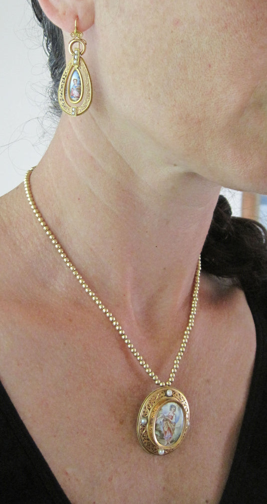 Fine French Victorian Painted Porcelain Earrings and Pendant / Brooch Parure