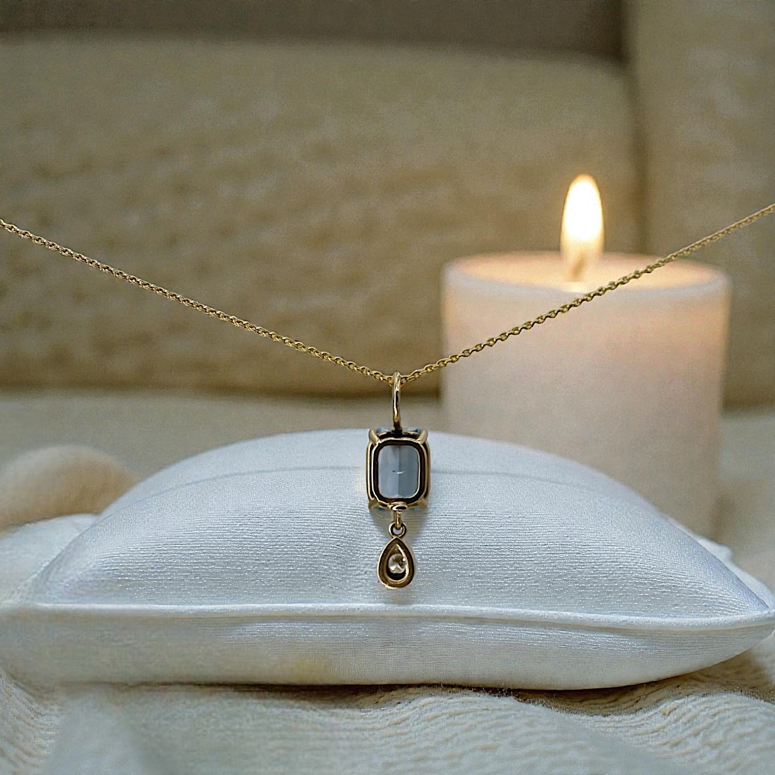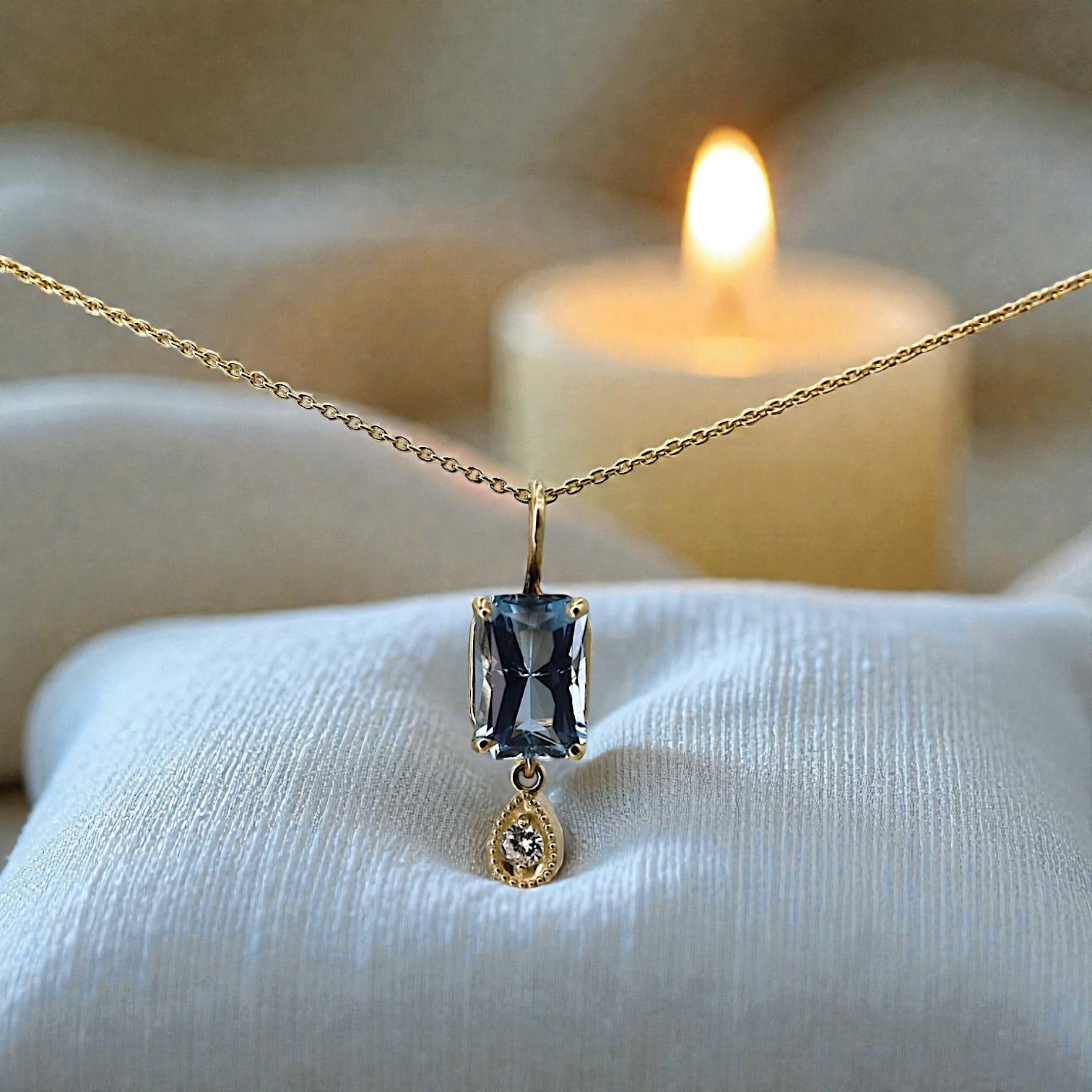 This pendant is a one-of-a-kind piece, we sourced this Vietnamese aquamarine from the Tucson Gem Show and set it in a timeless basket setting with a repurposed diamond catching the light. The cool blue of the emerald-cut aquamarine pairs beautifully with the warm gold, while the upcycled diamond adds a subtle, timeless sparkle.