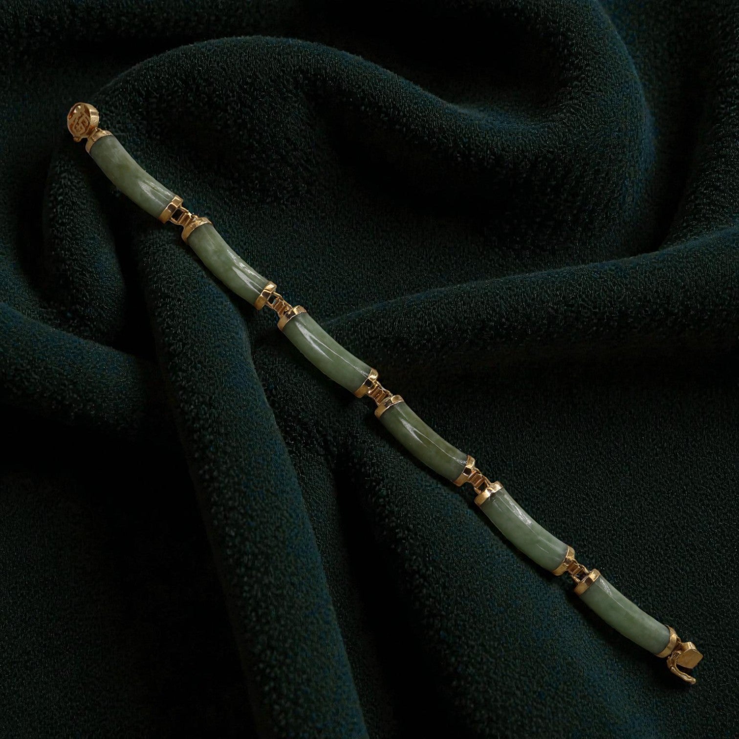 This collectible mid‑century green jade bracelet showcases a double row of smooth jade segments, joined by warm 14k gold caps and hinges for fluid, comfortable movement on the wrist. The bracelet evokes the era when American travelers crossed the Pacific to Hong Kong and other Asian ports, returning home with exquisite jade treasures as lifelong mementos of their journeys.