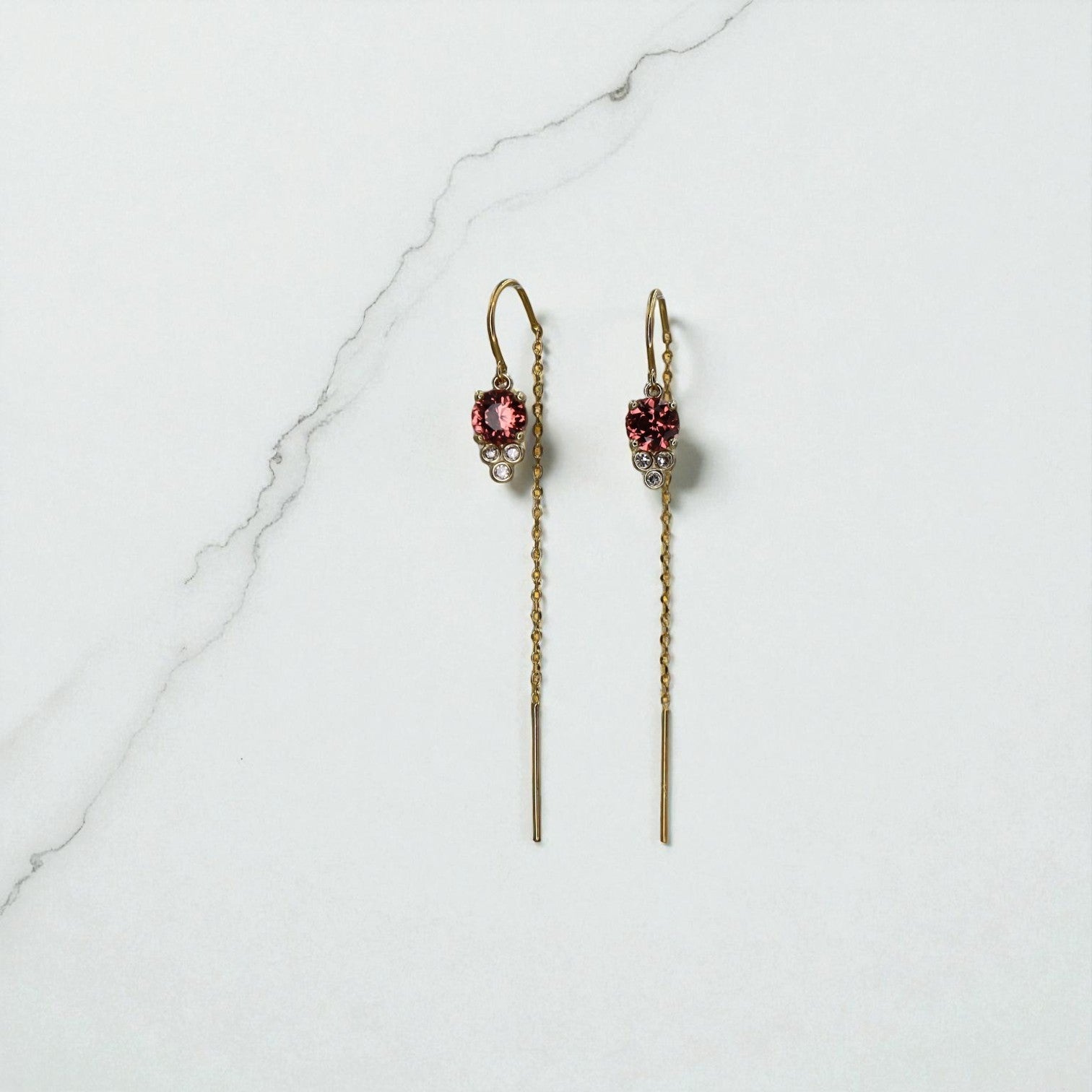 These ethically sourced Malayan garnets—2 = 1.20 cts from Tanzania, 5 mm round—are showcased in signature threader earrings, crafted in 14k yellow gold. Each earring features a beautiful salmon-peach-pink color garnet and is accented with a cluster of six, 0.06 ct total, single cut breakout diamonds (1.2 mm bezel set) for just the right touch of sparkle.