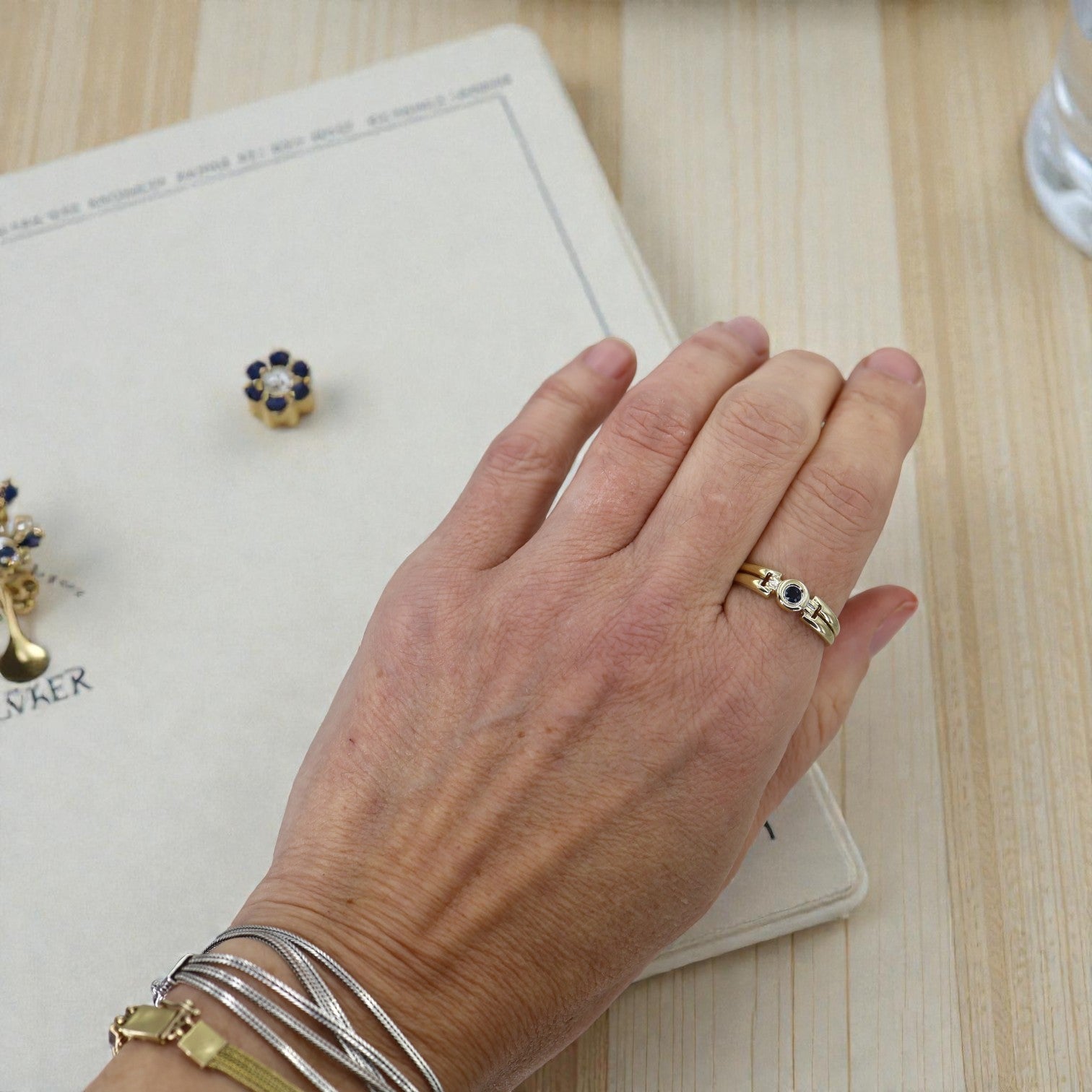 • Material: 8k yellow gold band (marked 333), 8k white gold bezel