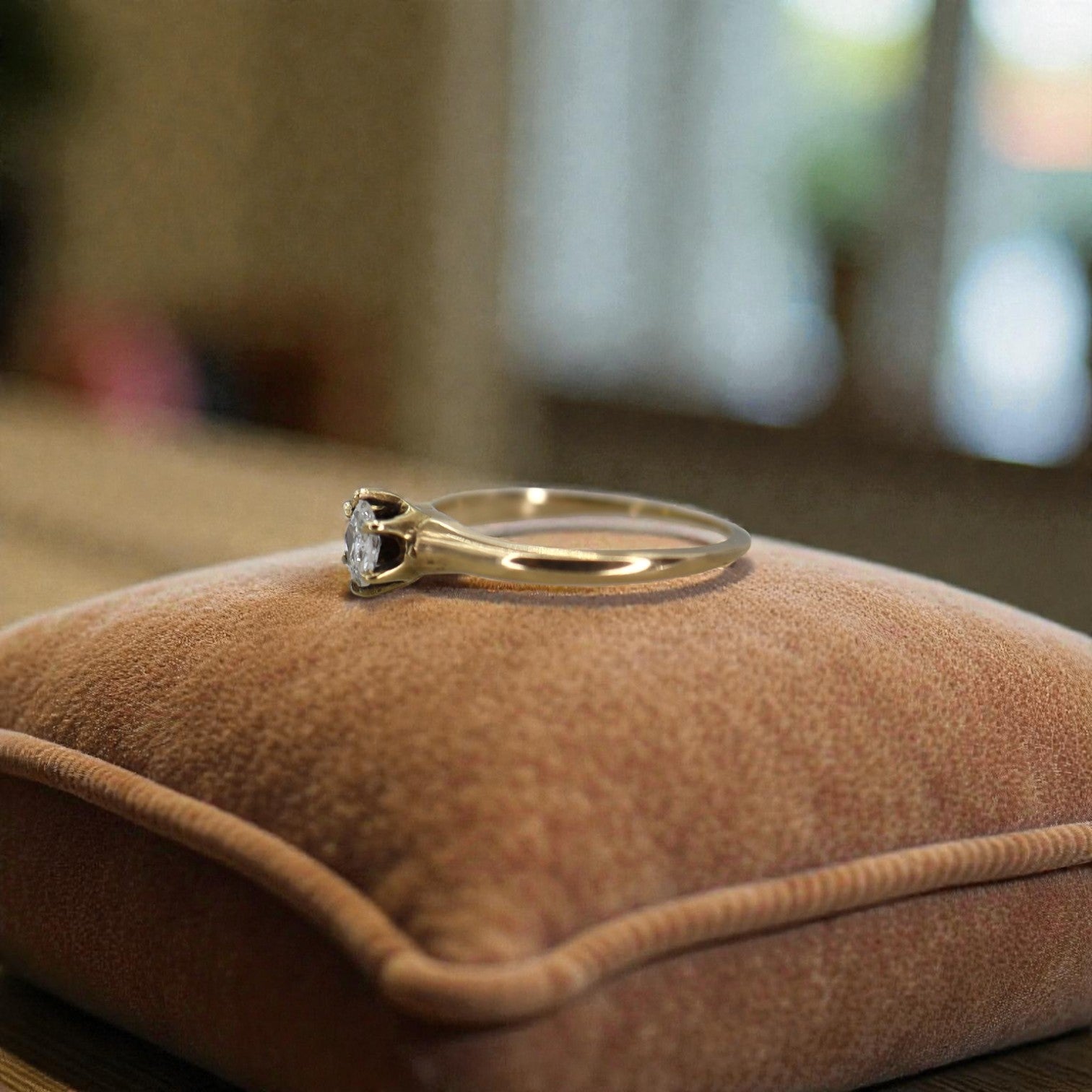 This one-of-a-kind antique solitaire features a rare old mine cut “Moval”—a beautifully proportioned hybrid between oval and round—set in a robust yet refined 14k yellow gold mounting. The original setting’s wear patterns tell the story of a lifetime of wear alongside a wedding band, adding authentic character and provenance. Ideal for collectors seeking distinctive vintage engagement rings with genuine cut personality.