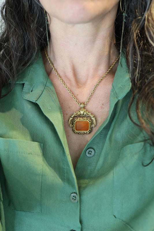 Antique Carnelian Locket Fob with Intricate Repoussé Hunting Dog Design