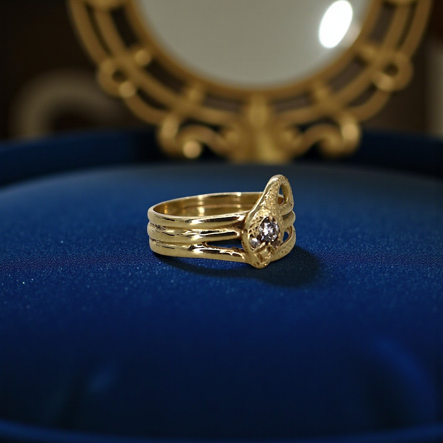 Celebrate the enduring allure of antique symbolism with this estate snake ring, an authentic turn-of-the-century treasure. Crafted in glowing yellow gold and dated circa 1905, this rare ring coils gracefully around the finger—a timeless token of eternal love, luck, and transformation. The serpent’s eyes glimmer with rose-cut diamonds, while a brilliant 0.11-ct round diamond is elegantly set in its head. With its blend of Old World charm and Victorian meaning, this piece is the perfect gift for collectors and lovers of symbolic jewelry.