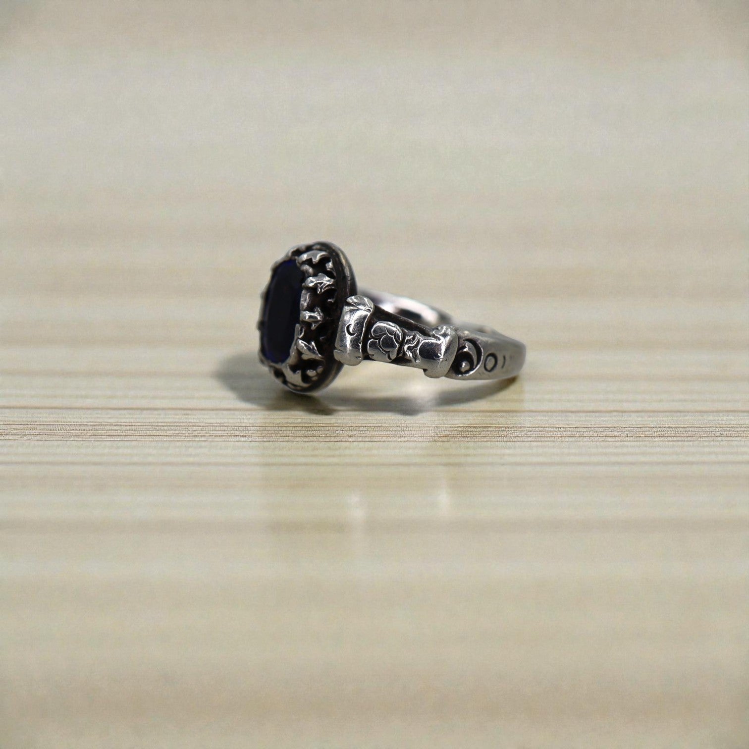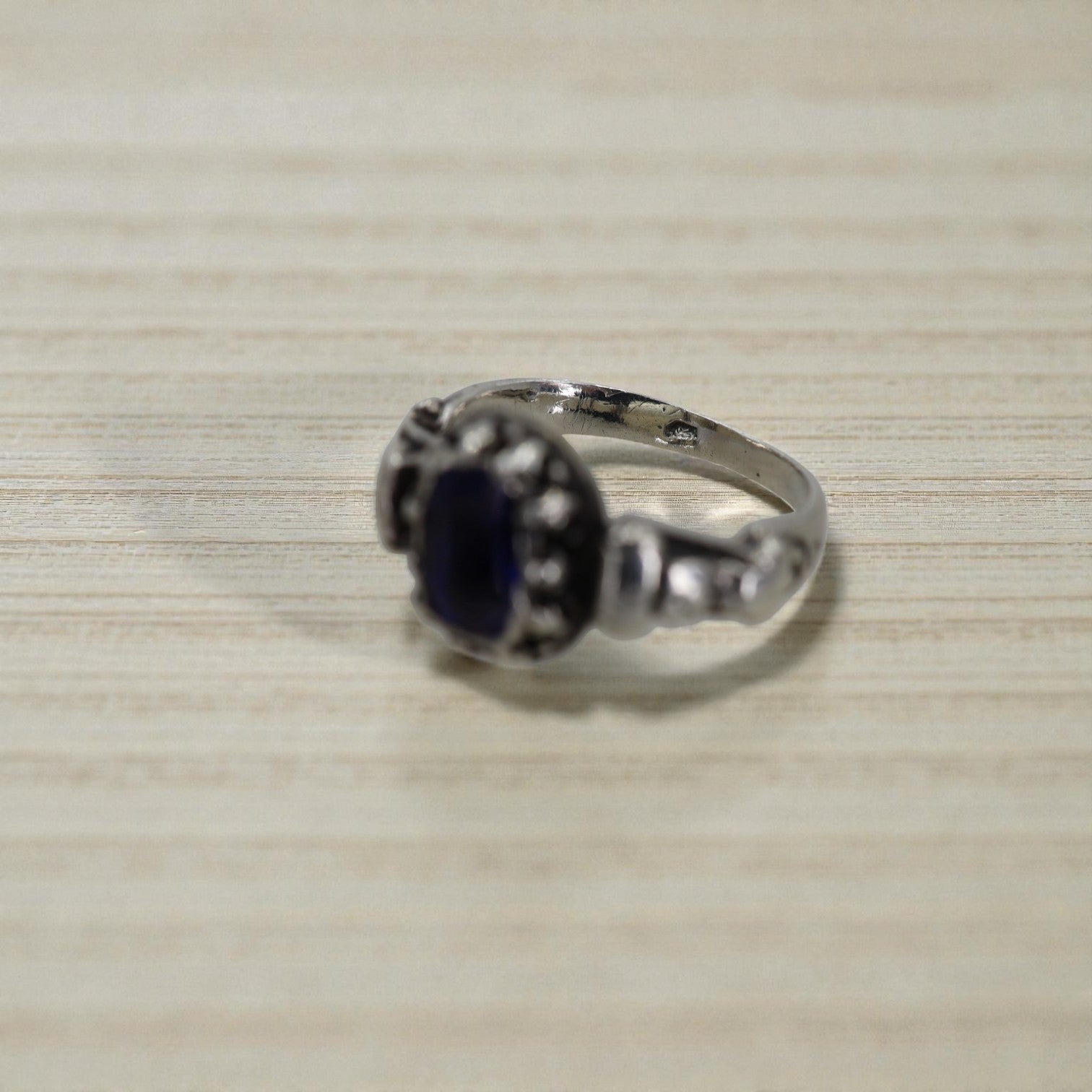This rare Georgian silver ring showcases an original foiled, closed-back setting around a vivid blue cushion-cut stone believed to be kyanite, bezel set for a soft, antique profile. The indistinct maker’s mark, tapered shank, and glowing foil-backed construction are all hallmarks of early 19th-century craftsmanship, offering a beautifully preserved, wearable piece of jewelry history.